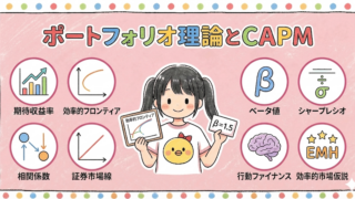 1. 概要ポートフォリオ理論は、複数の資産を組み合わせて投資することで、リスクを抑えながら効率的なリターンを追求するための理論体系です。期待収益率・分散・共分散・相関係数といった統計的な概念を基盤とし、効率的フロンティア・CAPM・パフォー...
