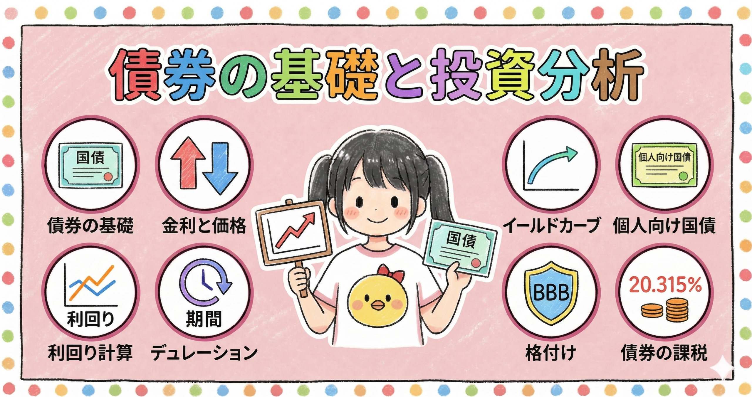 債券は国・地方公共団体・企業などが資金調達のために発行する有価証券です。あらかじめ利率(クーポン)と償還期限が決まっており、定期的に利息を受け取りながら満期に元本が返還される「確定利付き」の金融商品です。CFP試験では利回り計算(4種類)・デュレーション・各リスクの理解・課税関係が頻出です。