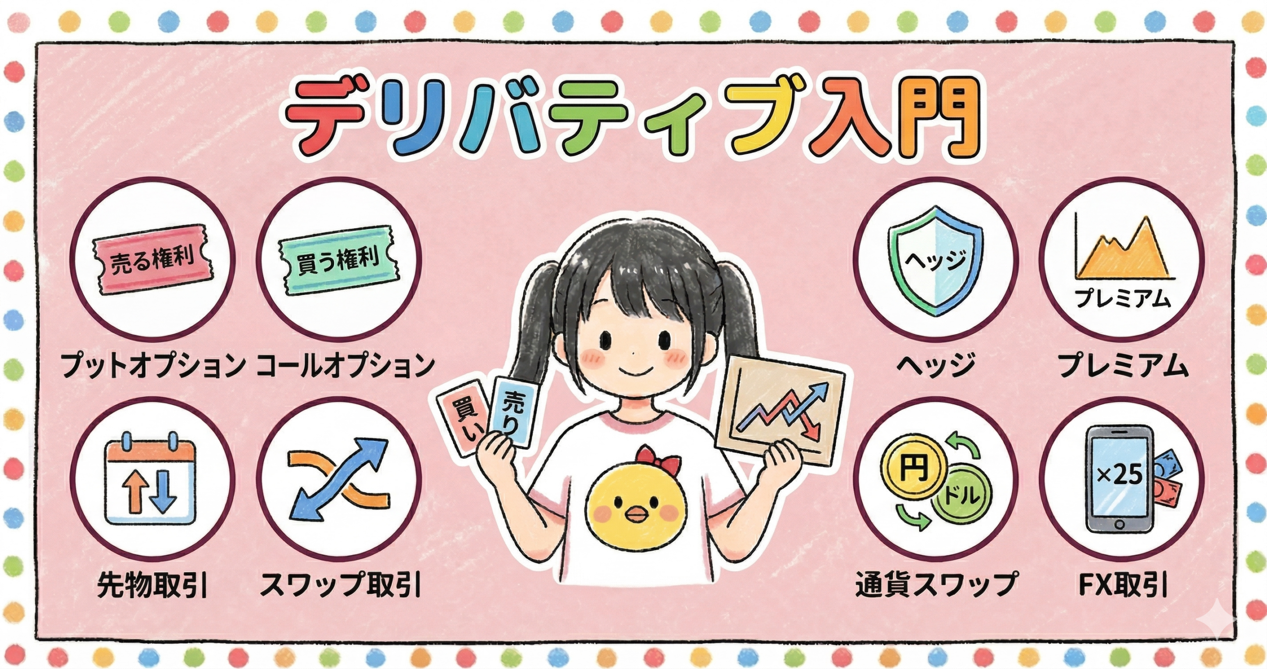 デリバティブ(派生商品)とは、株式・債券・通貨・商品等の原資産から派生した金融商品の総称です。先物取引・オプション取引・スワップ取引の3種類が主なものです。ヘッジ(リスク回避)や投機(レバレッジを活用した利益追求)に利用されます。CFP試験では各取引の仕組み・損益の計算・オプションのプレミアム・FX(外国為替証拠金取引)の特徴と課税関係が頻出テーマです。