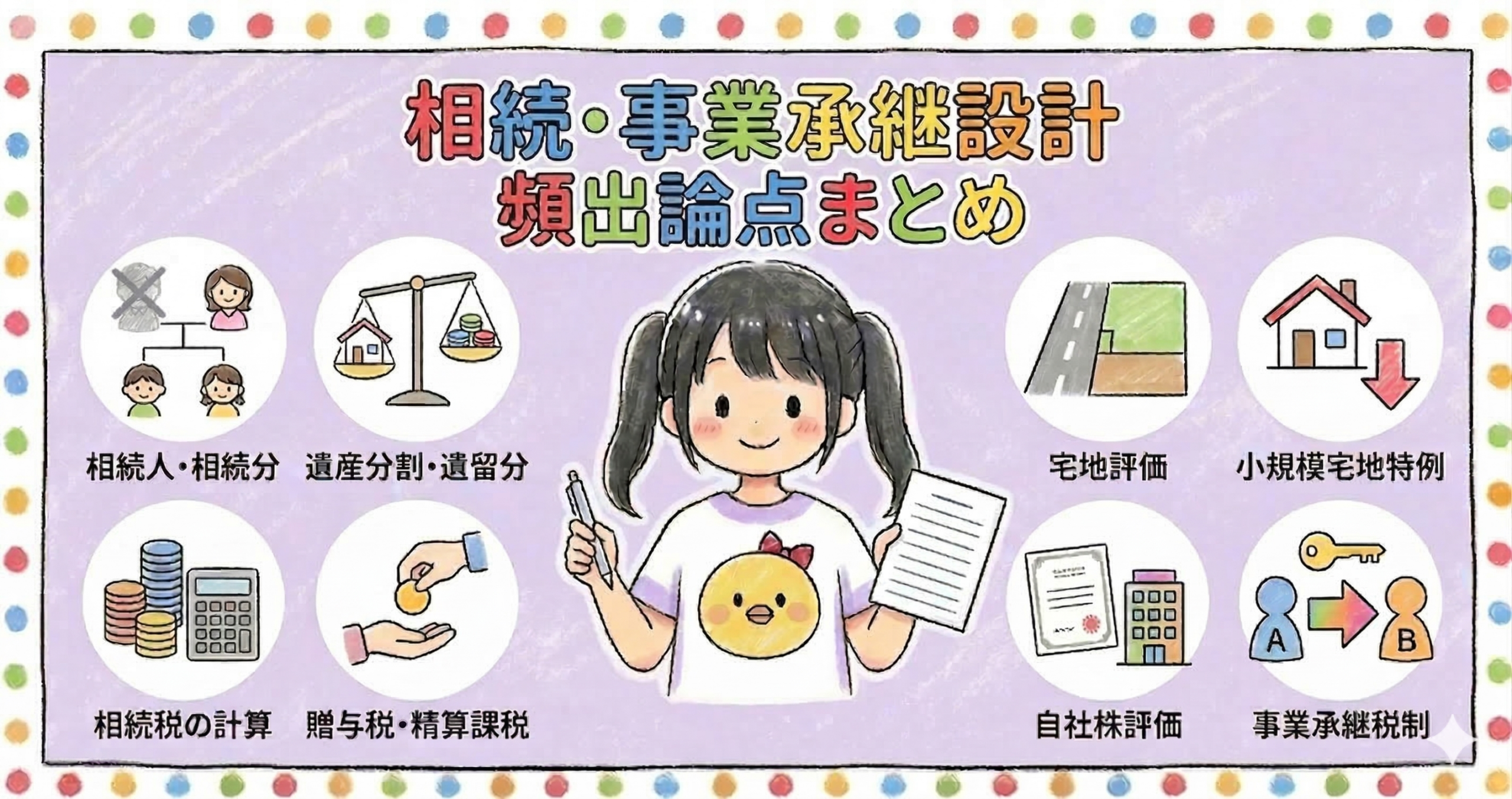 CFP試験「相続・事業承継設計」は、民法上の相続知識から相続税・贈与税の計算、財産評価、事業承継対策まで幅広い分野にわたります。この記事では、各分野の頻出論点と計算パターンを横断的に整理します。令和5・6年度の税制改正点も含めてまとめていますので、試験直前の総仕上げにご活用ください。