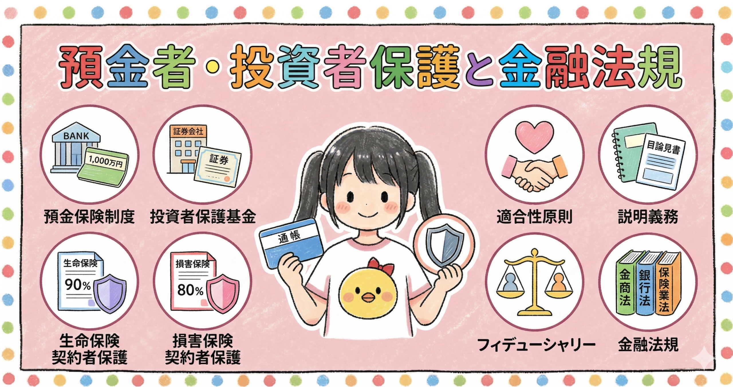 金融取引を行う預金者・投資者を保護するための枠組みとして、預金保険制度・投資者保護基金・保険契約者保護機構などのセーフティネットが整備されています。また、金融商品取引法・銀行法・消費者契約法などの法令が金融機関の行為規制を定め、フィデューシャリー・デューティー(受託者責任)やフィンテックへの対応も近年重要度が増しています。CFP試験では各セーフティネットの保護対象・保護限度額・適合性原則・説明義務が頻出テーマです。