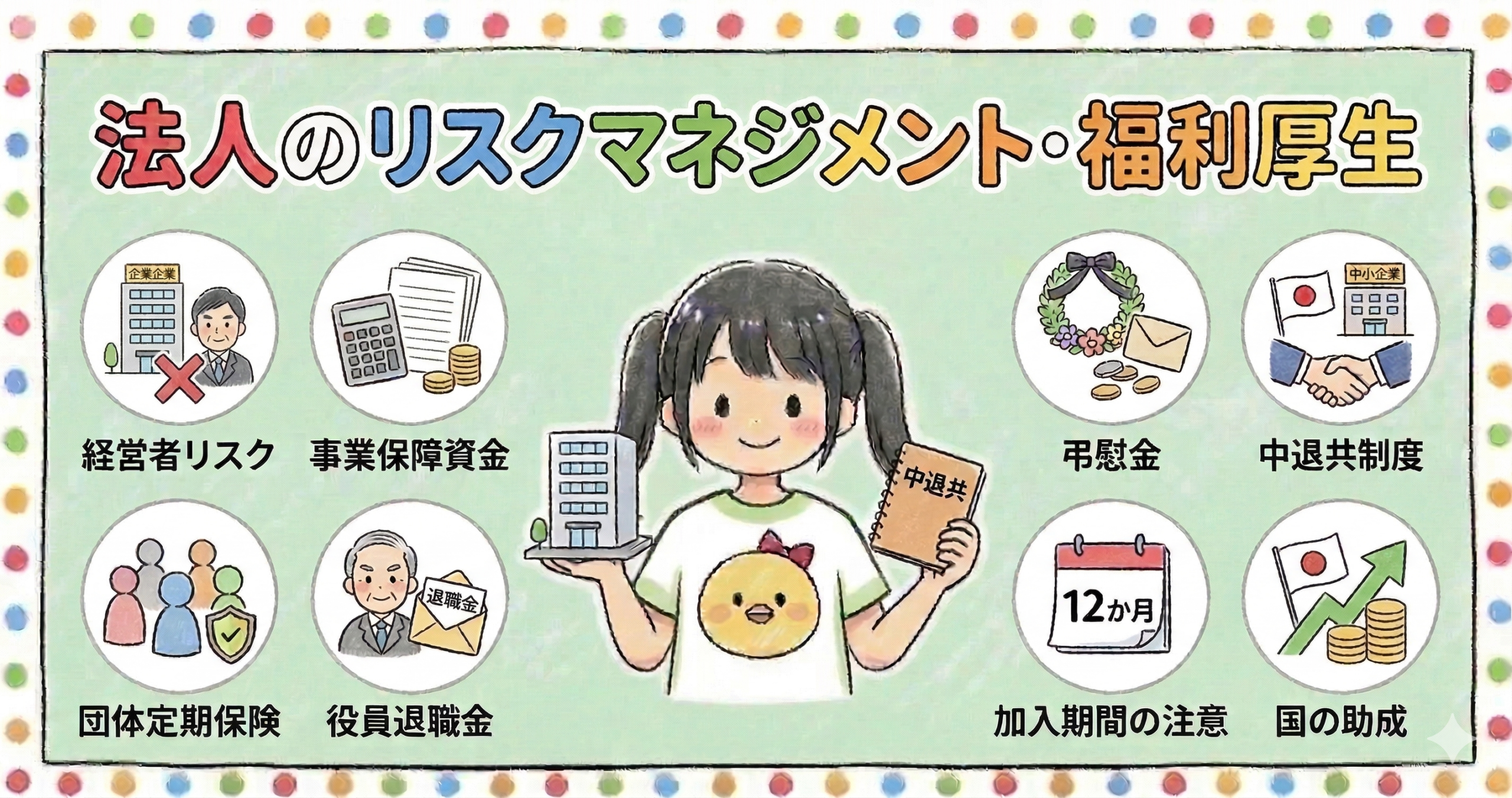 法人(中小企業)のリスクマネジメントでは、経営者・役員の死亡や疾病による事業への打撃、退職金・弔慰金の財源確保、従業員の福利厚生の整備が主要な課題です。CFP試験では、事業保障資金の考え方と必要保障額の算出、役員退職金の功績倍率法による計算、弔慰金の相続税上の非課税枠、福利厚生としての総合福祉団体定期保険・養老保険の活用、そして中小企業退職金共済(中退共)制度の仕組みと国の助成制度が頻出論点です。