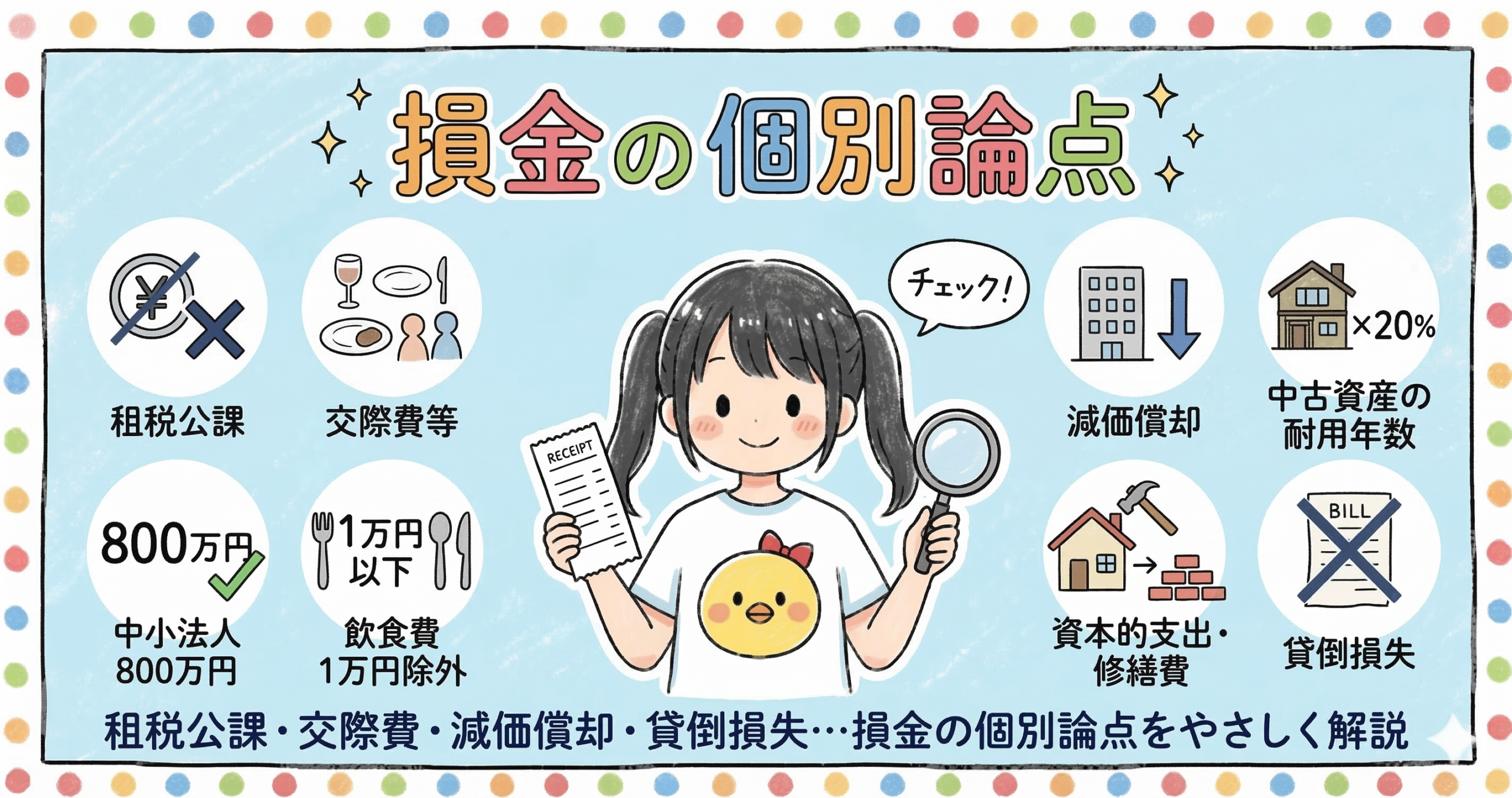 - 損金不算入の租税公課:法人税・法人住民税の本税・加算税・延滞税・罰金。事業税・固定資産税等は損金算入可