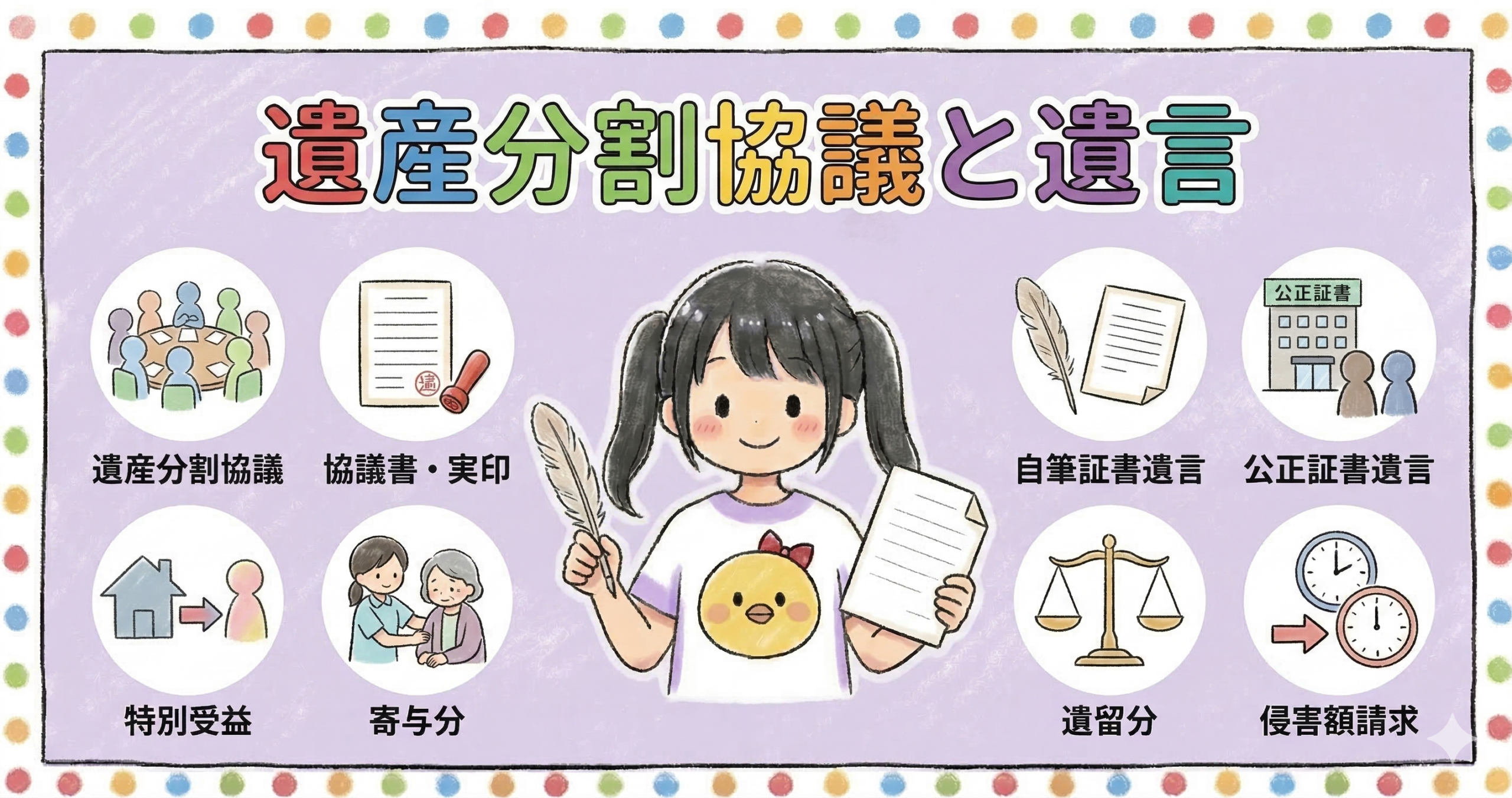相続が開始すると、相続財産は相続人全員の共有状態になります。それを各人の手に確定的に移すのが「遺産分割」です。遺産分割には被相続人の遺言による方法と、相続人全員の話し合いによる方法があります。この記事では遺産分割の方法・手続きの流れ・特別受益と寄与分・遺言の3種類の方式と要件・遺留分まで、CFP試験頻出の論点を体系的に整理します。
