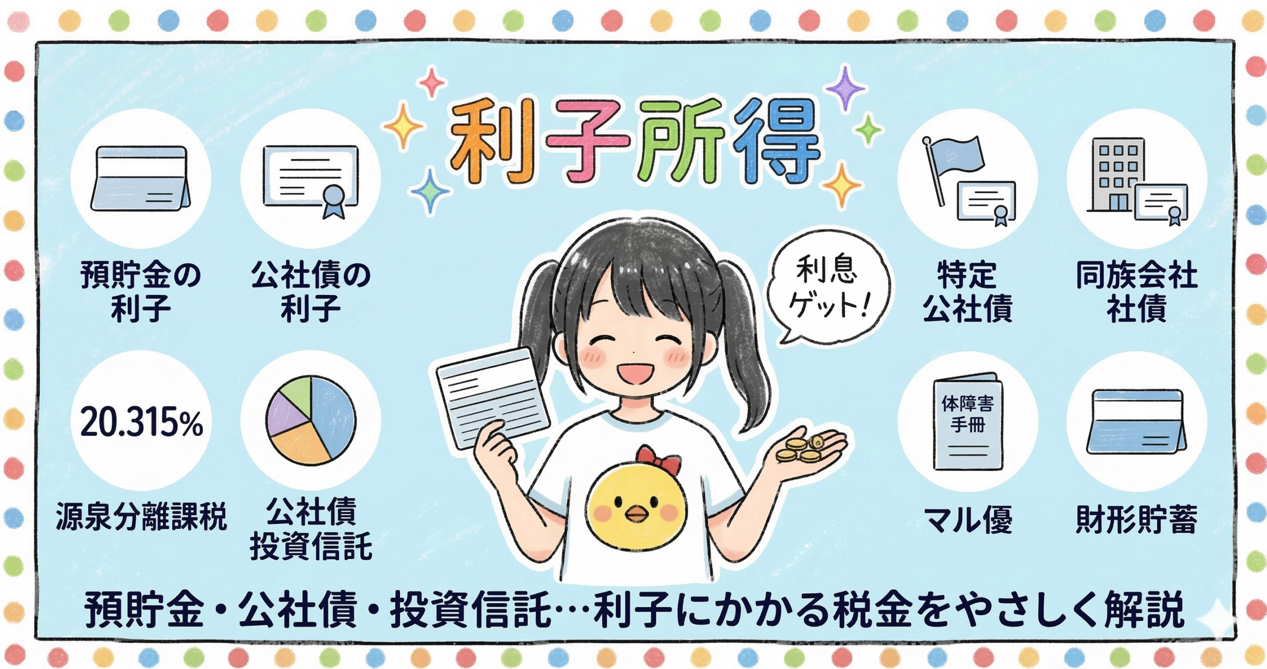 利子所得とは、公社債および預貯金の利子ならびに合同運用信託、公社債投資信託および公募公社債等運用投資信託の収益の分配に係る所得をいう。(所得税法第23条第1項)