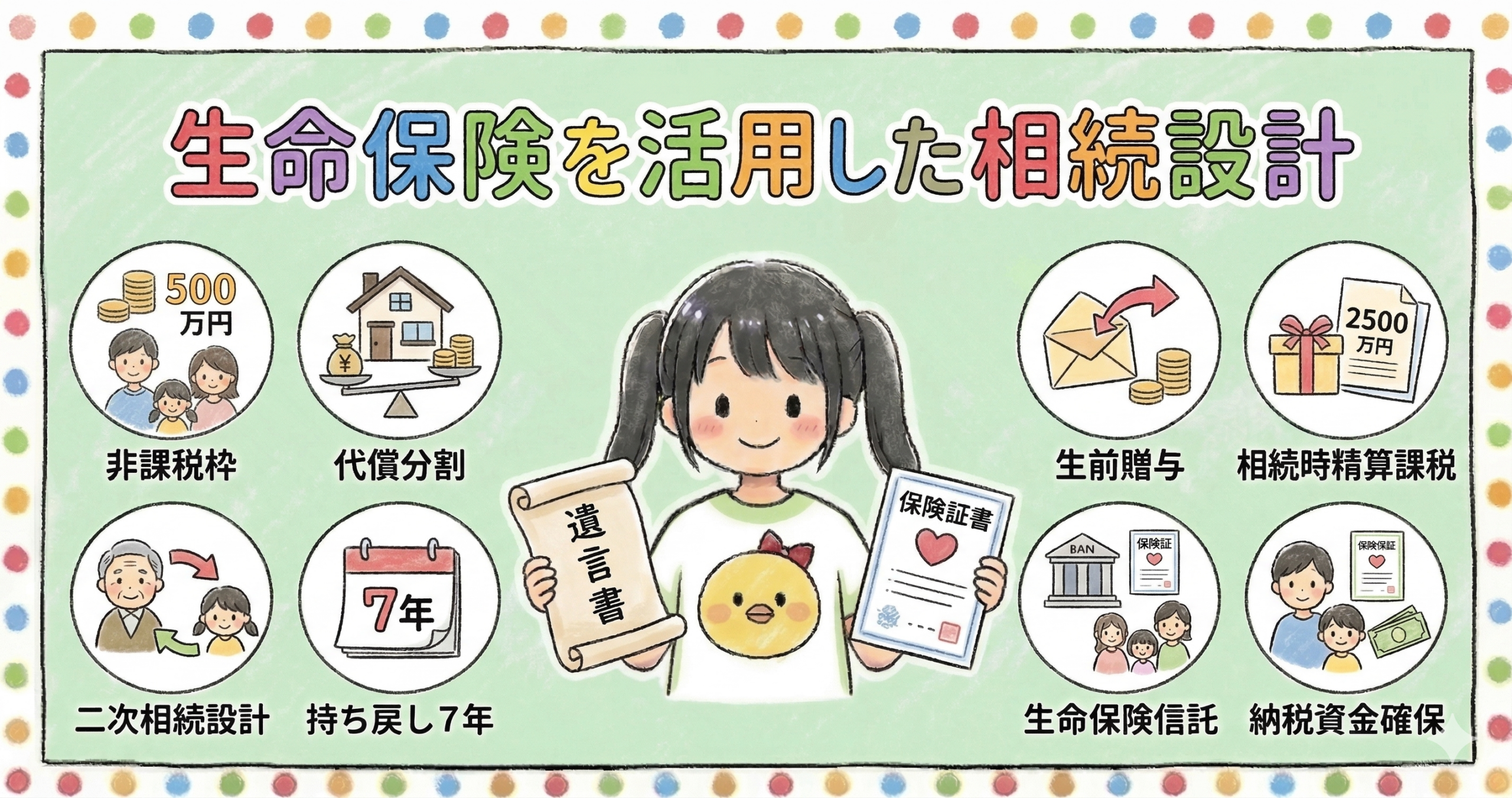 生命保険は相続設計において非常に有効なツールです。死亡保険金の非課税枠の活用、納税資金の確保、遺産分割の円滑化、代償分割の原資準備、二次相続対策など、多角的な用途があります。CFP試験では、非課税限度額の計算・各相続人の課税額の算出、受取人設定と課税関係、代償分割における生命保険の活用上の注意点、生前贈与との組み合わせ(持ち戻し期間延長を含む)、生命保険信託の仕組みが頻出論点です。なお、2024年1月からの相続税法改正で生前贈与の持ち戻し期間が3年から最長7年に延長されており(段階的移行中)、この点も押さえておく必要があります。