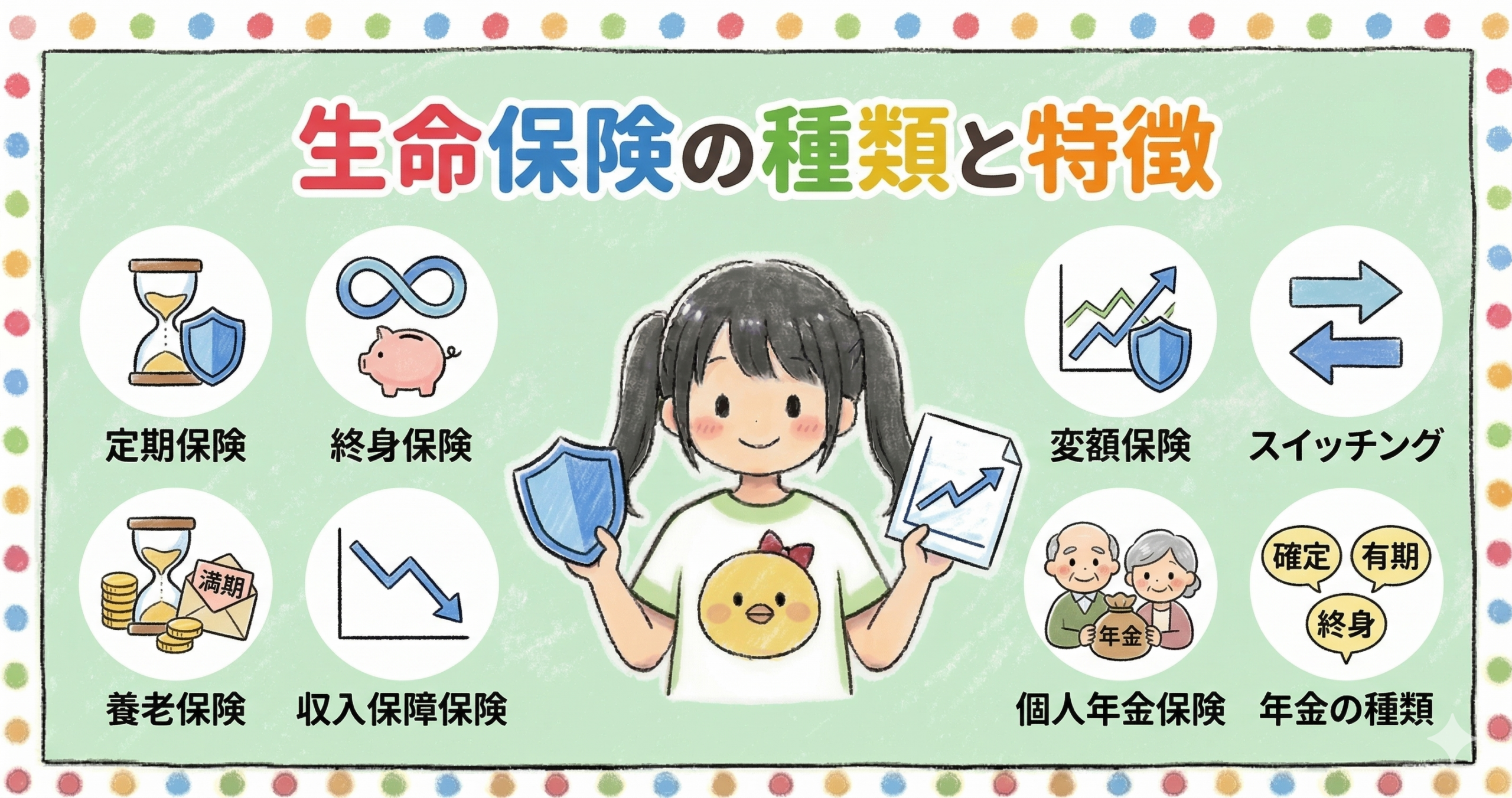 - 生命保険の3基本形:定期(掛け捨て・有期)、終身(貯蓄性・終身)、養老(生死混合・有期)