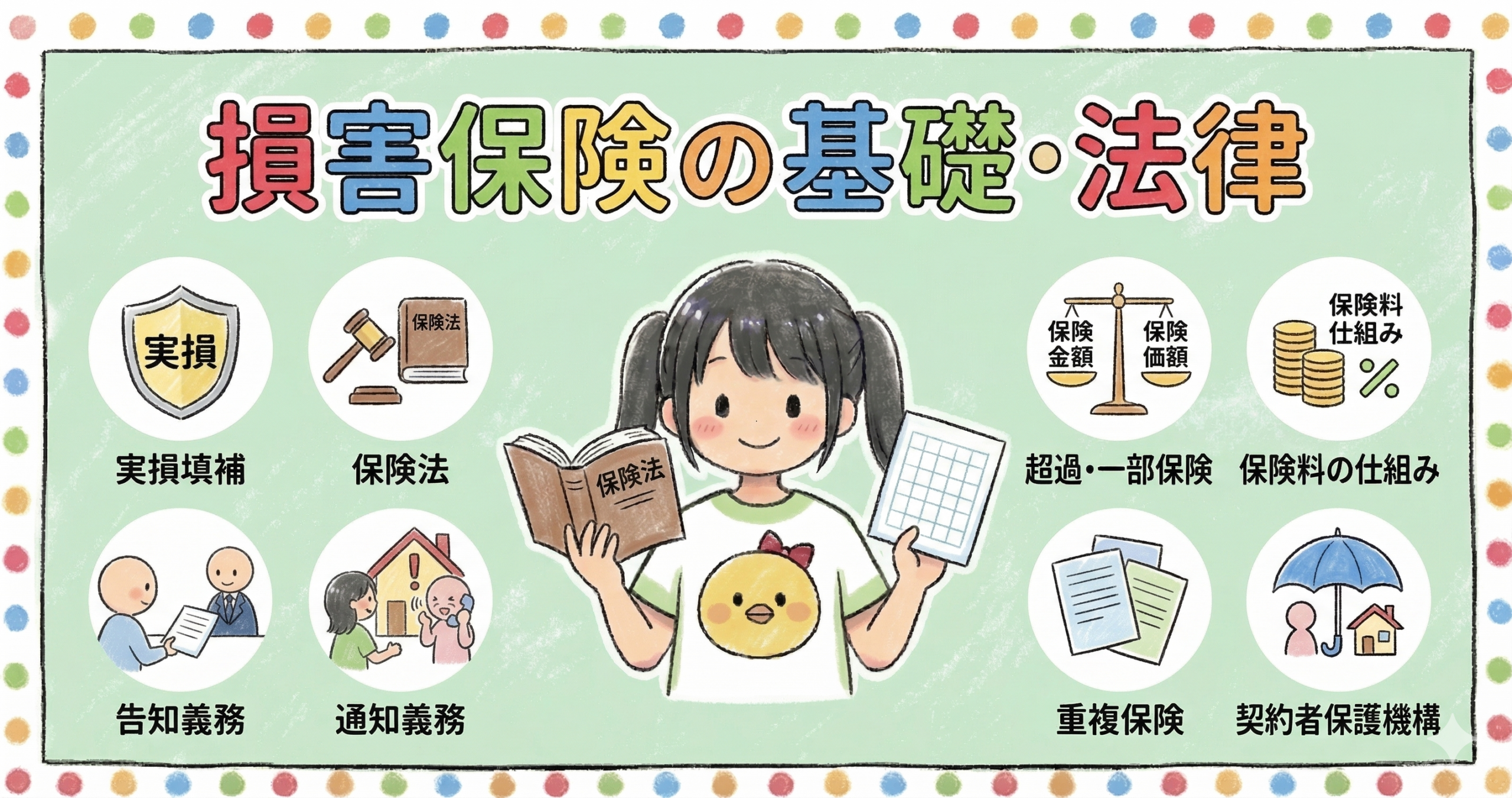 損害保険は、偶然の事故による損害を実際の損害額の範囲で填補することを目的とした保険です。生命保険が「定額払い」であるのに対し、損害保険は「実損填補」が基本原則となります。CFP試験では、損害保険を規律する法律(保険法・保険業法)の基本知識、告知義務・通知義務などの契約上の義務、保険料の算出の仕組み(純保険料・付加保険料)、超過保険・一部保険・重複保険の概念、そして損害保険契約者保護機構の補償割合が幅広く出題されます。