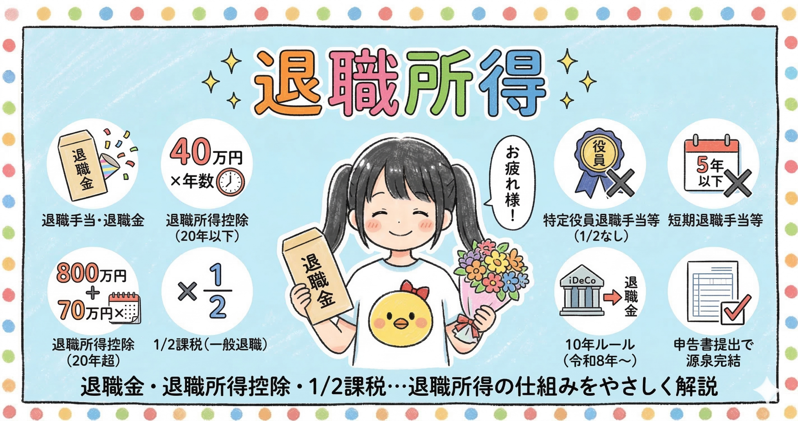 ※ただし、短期退職手当等・特定役員退職手当等については「× 1/2」の適用が制限されます(後述)。