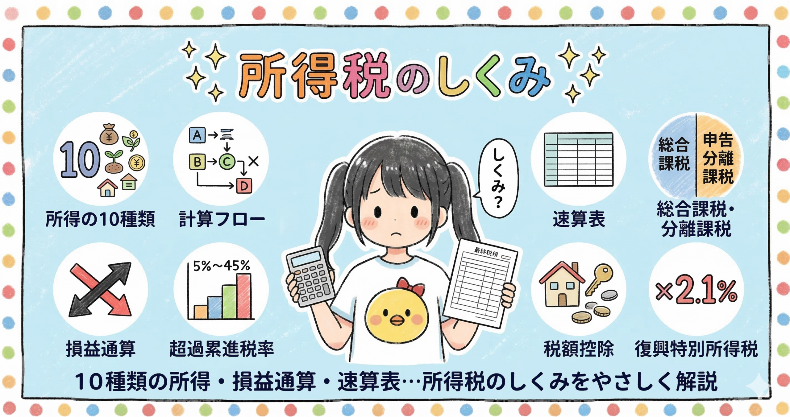 • 所得の10種類それぞれで計算方法が異なり、課税方式(総合・申告分離・源泉分離)も異なる